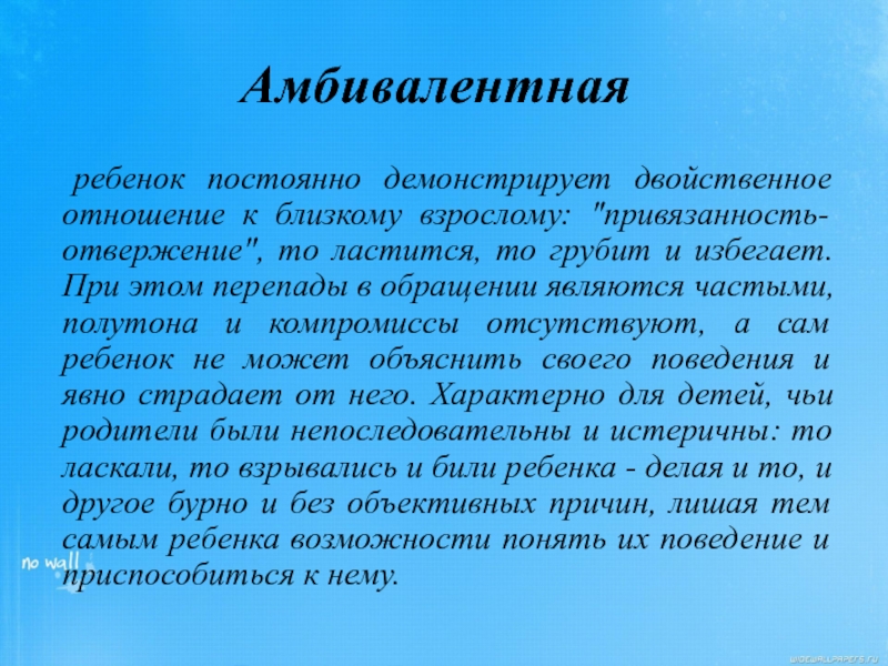 ребенок постоянно демонстрирует двойственное отношение к близкому взрослому: "привязанность-отвержение", то