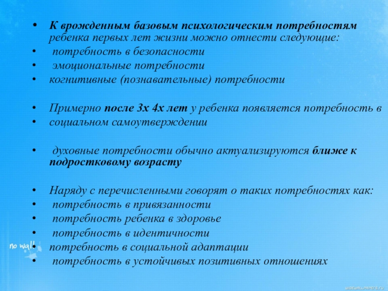 Слайд 4К врожденным базовым психологическим потребностям ребенка первых лет жизни можно