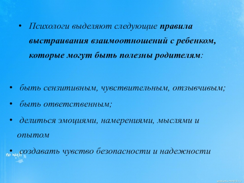Слайд 19Психологи выделяют следующие правила выстраивания взаимоотношений с ребенком, которые могут