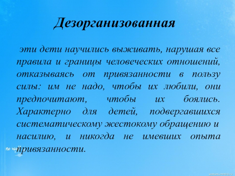 чтобы их любили, они предпочитают, чтобы их боялись. Характерно для детей, подвергавшихся систематическому жестокому обращению и насилию, и никогда не имевших опыта привязанности.
