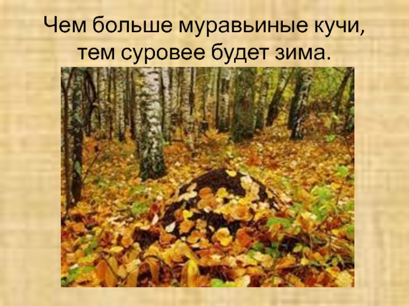Слайд 4Чем больше муравьиные кучи, тем суровее будет зима.