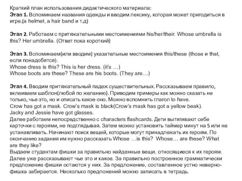 Выдаем студентам фишки за правильно найденные вещи, относящиеся к их героям. Далее уже рассказывают чье это и какое. За правильно построенное грамматически предложение фишки остаются у них. За предложение, составленное устно неверно-фишка забирается. Несколько предложений можно записать в тетрадь.