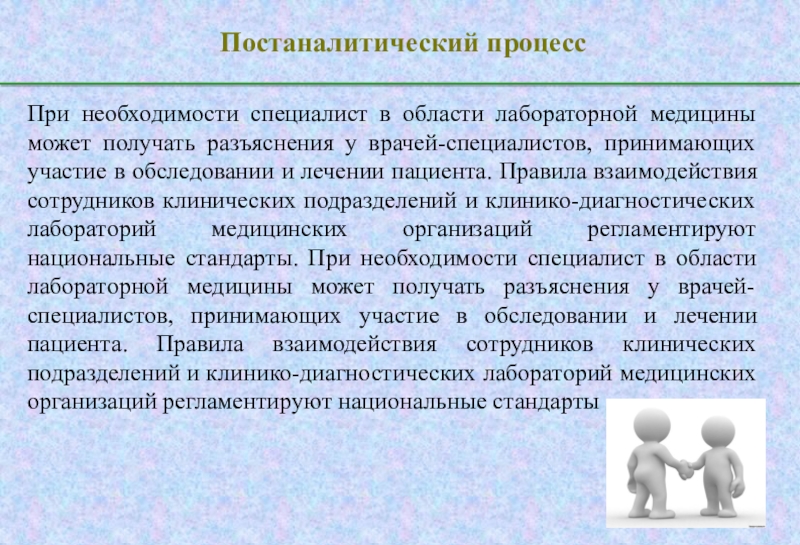 Правила взаимодействия сотрудников клинических подразделений и клинико-диагностических лабораторий медицинских организаций регламентируют национальные стандарты. При необходимости специалист в области лабораторной медицины может получать разъяснения у врачей-специалистов, принимающих участие в обследовании и лечении пациента. Правила взаимодействия сотрудников клинических подразделений и клинико-диагностических лабораторий медицинских организаций регламентируют национальные стандарты