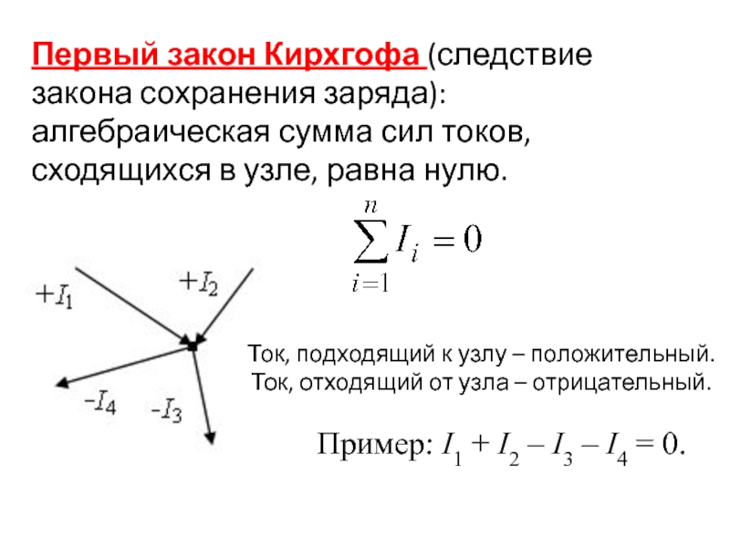 Слайд 36Первый закон Кирхгофа (следствие закона сохранения заряда): алгебраическая сумма сил