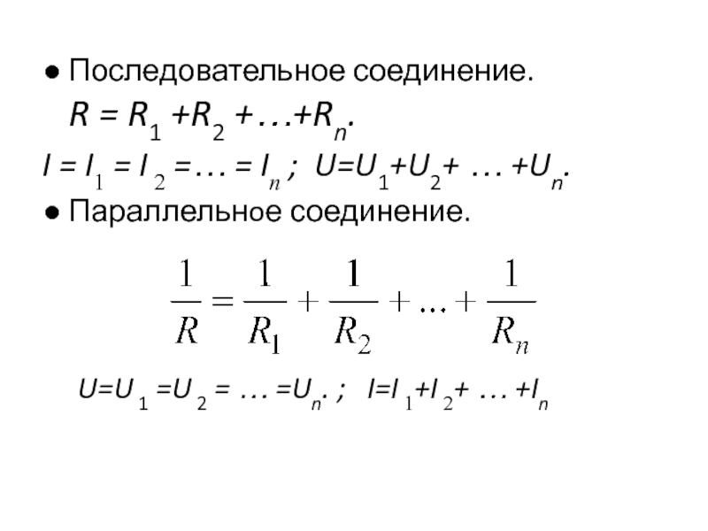 Слайд 19● Последовательное соединение. R = R1 +R2 +…+Rn.