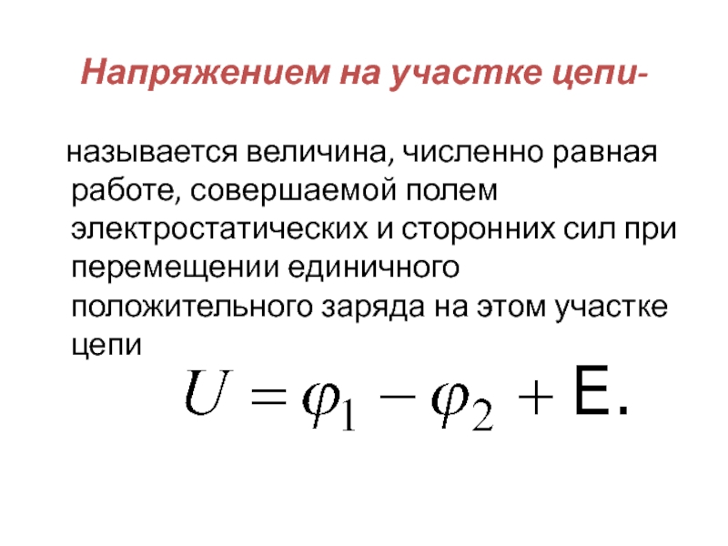 Слайд 13Напряжением на участке цепи-