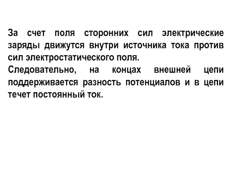 Слайд 10За счет поля сторонних сил электрические заряды движутся внутри источника