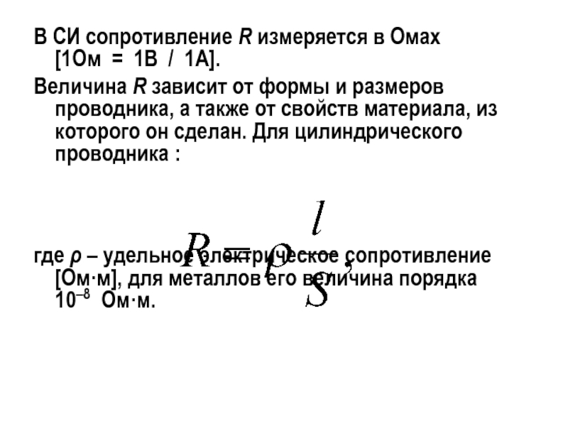 Слайд 16В СИ сопротивление R измеряется в Омах [1Ом = 1В / 1А].