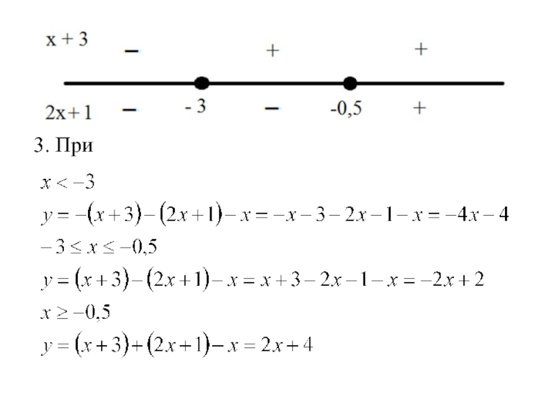 Раскрываем модуль на каждом промежутке и получаем соответствующие уравнения функции.