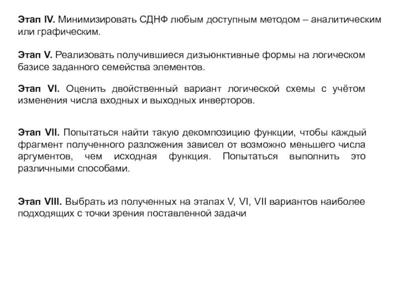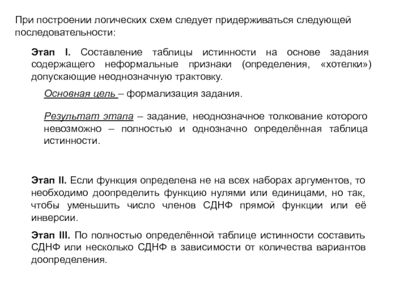 Результат этапа – задание, неоднозначное толкование которого невозможно – полностью и однозначно определённая таблица истинности.