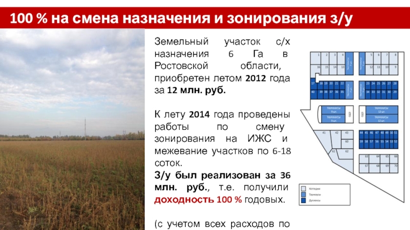 Собственник земельного участка входит в Проект земельным участком (оценка 42,5 млн. руб.), Инвестор – денежными средствами от 21 250 000 руб. (доля 1/3) до 42 500 000 руб. (доля 50 %).