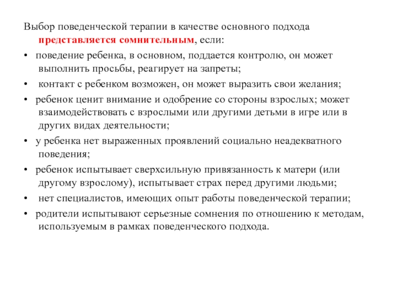 Слайд 10Выбор поведенческой терапии в качестве основного подхода представляется сомнительным, если: