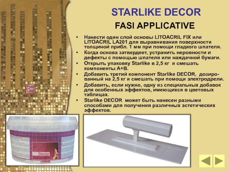 где плиточные швы заштукатурены эпоксидным составом Starlike, и окружающими стенами, отделанными с помощью Starlike Decor. Эта система позволяет отделывать вертикаль-ные поверхности из цементных штукатурок, гипса, панелей из дерева и гипсокартона, облегченных панелей типа WEDI, поверхностей покрытых старой плиткой.
