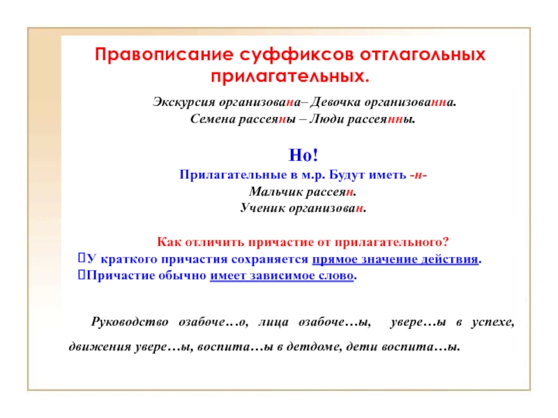Руководство озабоче…о, лица озабоче…ы, увере…ы в успехе, движения увере…ы, воспита…ы в детдоме, дети воспита…ы.