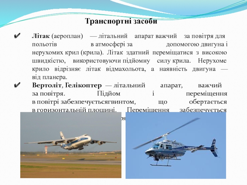 Слайд 2 Повітряний транспорт – вид транспортних комунікацій транспорту, де у якості транспортного засобу для перевезення пасажирів, пошти і вантажів використовуються транспортні