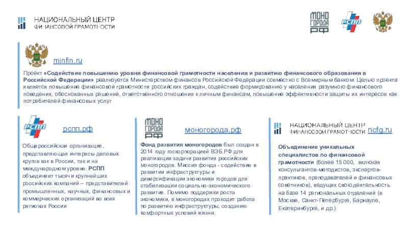 Объединение уникальных специалистов по финансовой грамотности (более 15 000, включая консультантов-методистов, экспертов-практиков, преподавателей и финансовых советников), ведущих свою деятельность на базе 14 региональных отделений (в Москве, Санкт-Петербурге, Барнауле, Екатеринбурге, и др.)