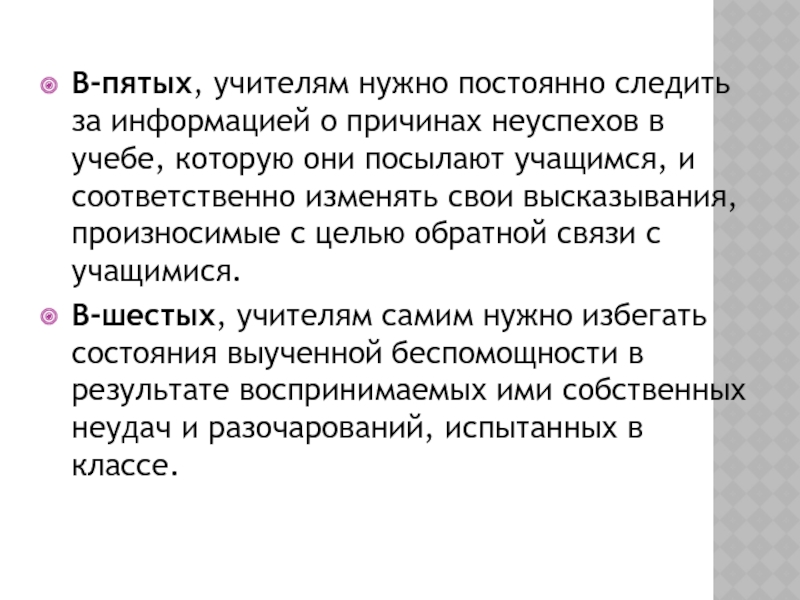 В-шестых, учителям самим нужно избегать состояния выученной беспомощности в результате воспринимаемых ими собственных неудач и разочарований, испытанных в классе.