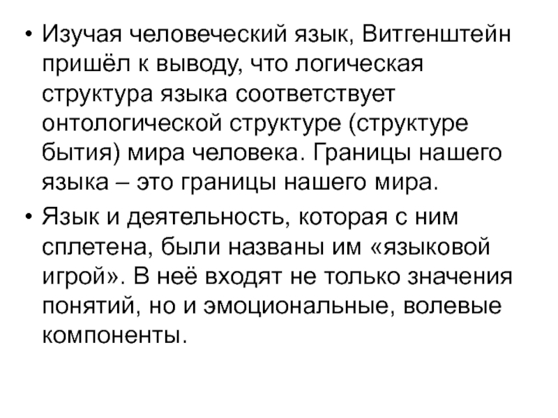 Слайд 17Изучая человеческий язык, Витгенштейн пришёл к выводу, что логическая структура