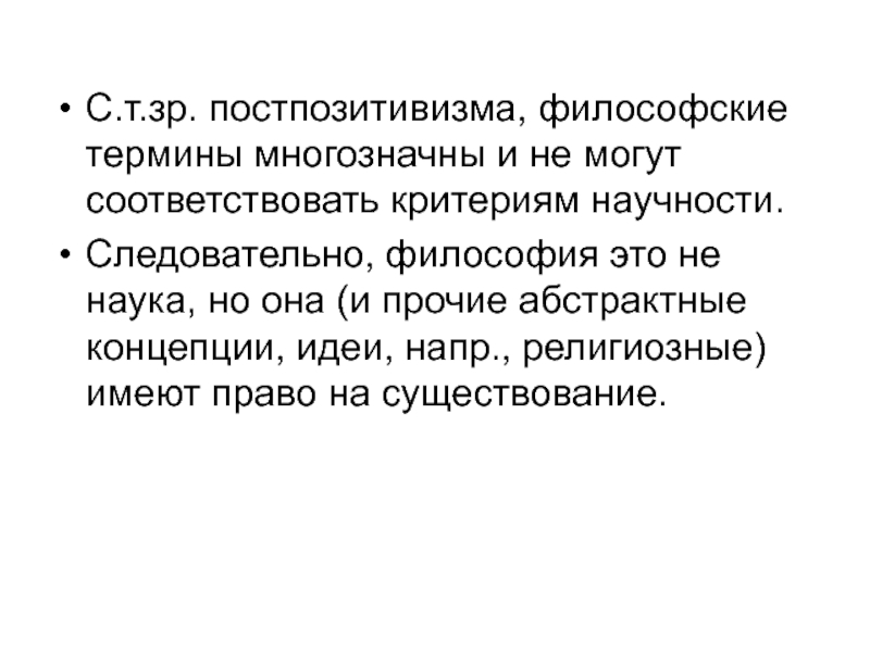 Слайд 24С.т.зр. постпозитивизма, философские термины многозначны и не могут соответствовать критериям