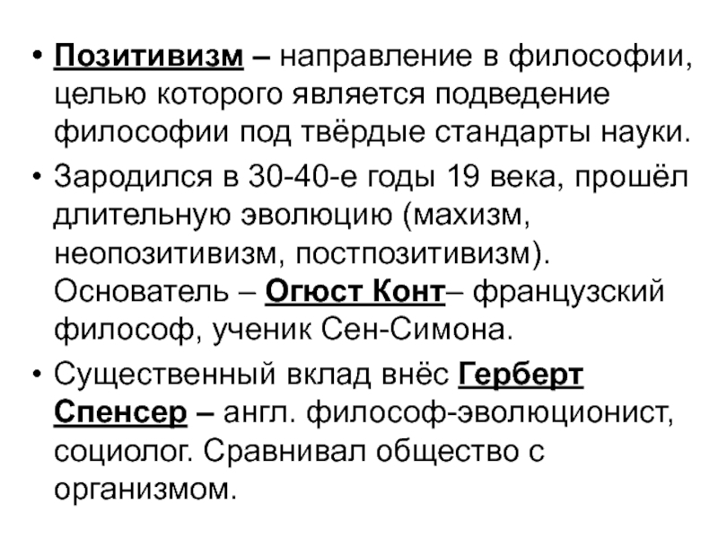 прошёл длительную эволюцию (махизм, неопозитивизм, постпозитивизм). Основатель – Огюст Конт– французский философ, ученик Сен-Симона.