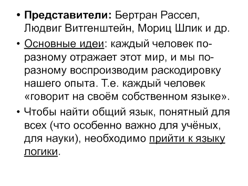 Слайд 13Представители: Бертран Рассел, Людвиг Витгенштейн, Мориц Шлик и др.