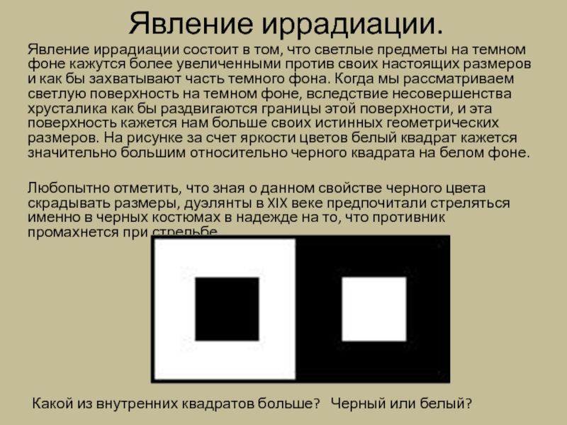 как бы захватывают часть темного фона. Когда мы рассматриваем светлую поверхность на темном фоне, вследствие несовершенства хрусталика как бы раздвигаются границы этой поверхности, и эта поверхность кажется нам больше своих истинных геометрических размеров. На рисунке за счет яркости цветов белый квадрат кажется значительно большим относительно черного квадрата на белом фоне.