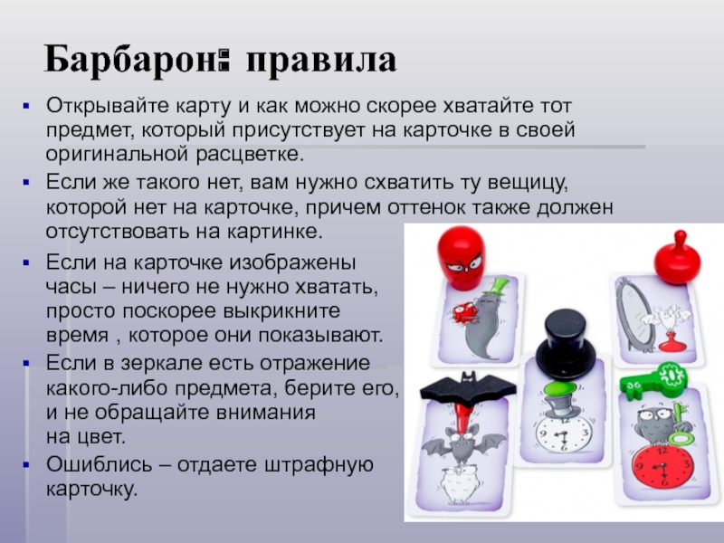 Если на карточке изображены часы – ничего не нужно хватать, просто поскорее выкрикните время , которое они показывают.