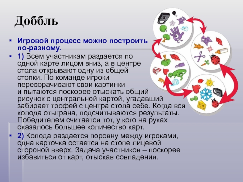 Цель: раньше других найти символ, совпадающий на двух карточках, громко его объявить, затем взять карточку себе, отдать другому или
