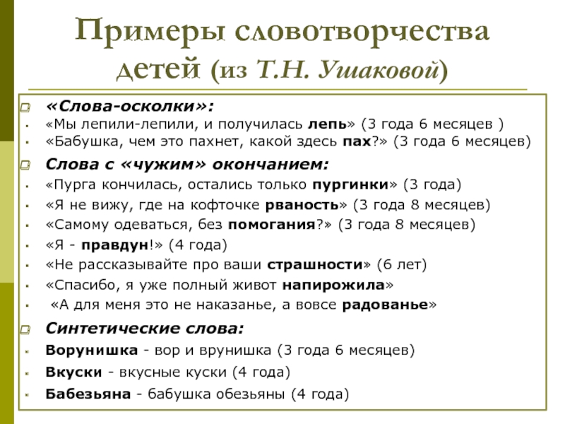 Слайд 63Примеры словотворчества детей (из Т.Н. Ушаковой)