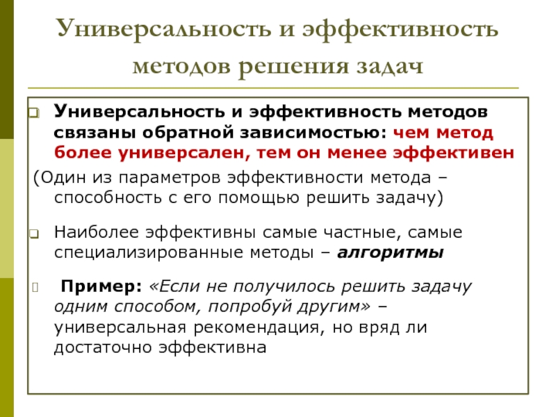обратной зависимостью: чем метод более универсален, тем он менее эффективен