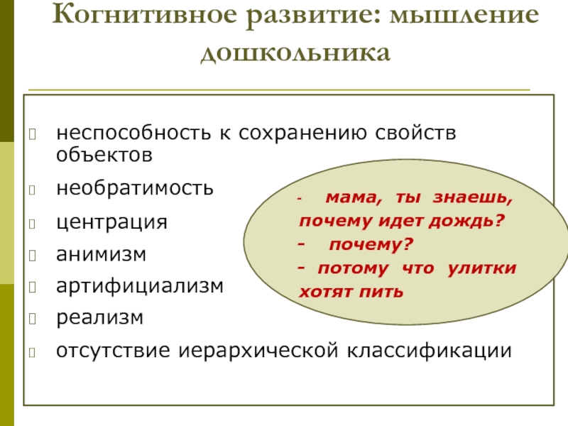 Усвоение языковых правил (2—2,5 года): вставает, скакает, нарисуть, посидю, поскаку (поскачу), на ковёре, деть, людь, вилком, ложком, нет бусов, много мозаиков, много дрянев