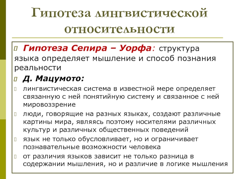 люди, говорящие на разных языках, создают различные картины мира, являясь поэтому носителями различных культур и различных общественных поведений