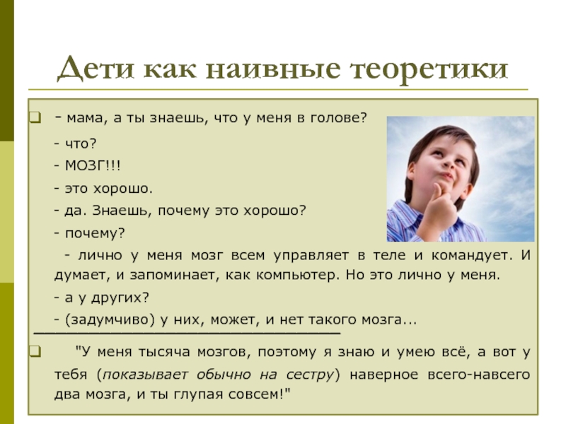 "У меня тысяча мозгов, поэтому я знаю и умею всё, а вот у тебя (показывает обычно на сестру) наверное всего-навсего два мозга, и ты глупая совсем!"