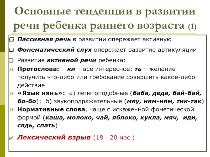 Слайд 58Основные тенденции в развитии речи ребенка раннего возраста (1)