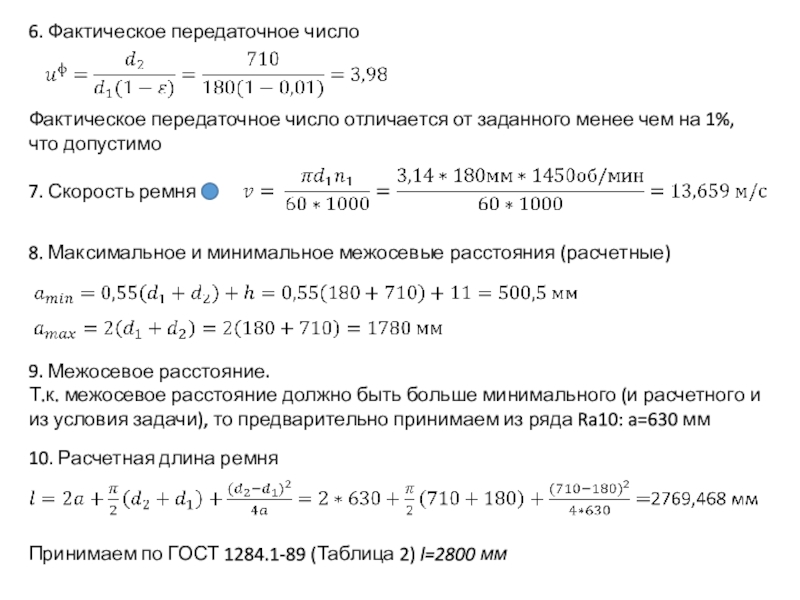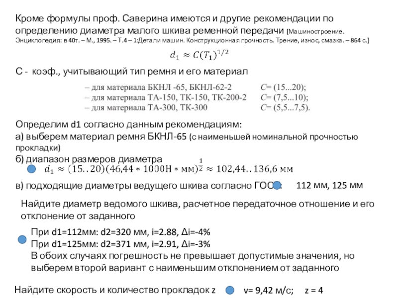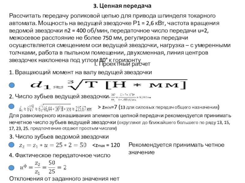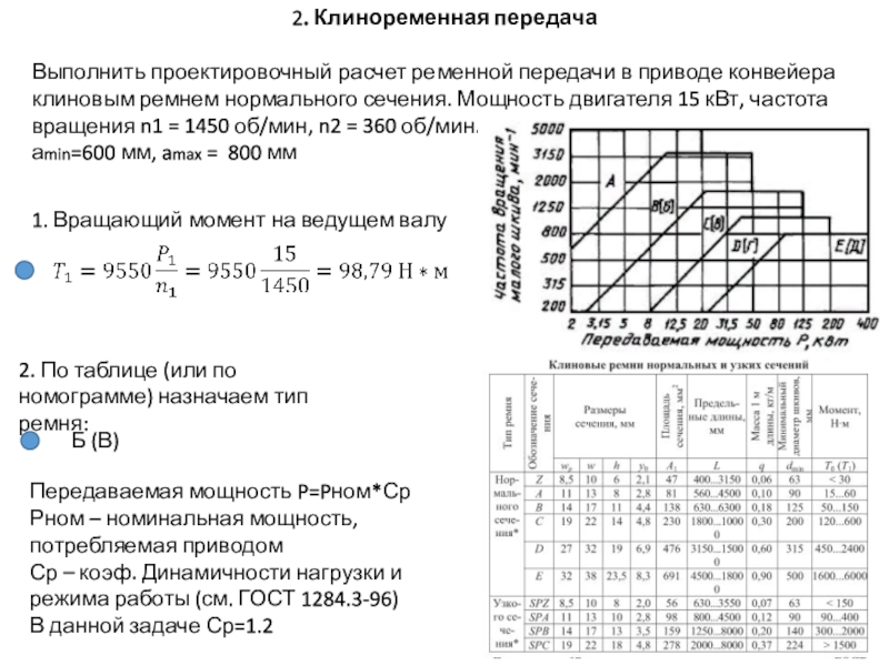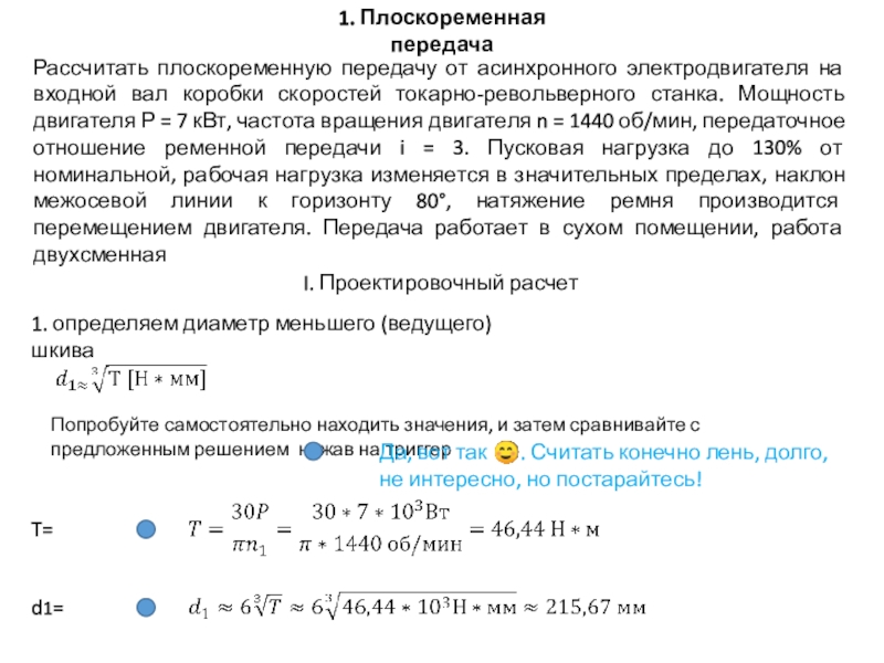 Рассчитать плоскоременную передачу от асинхронного электродвигателя на входной вал коробки скоростей токарно-револьверного станка. Мощность двигателя Р = 7 кВт, частота вращения двигателя n = 1440 об/мин, передаточное отношение ременной передачи i = 3. Пусковая нагрузка до 130% от номинальной, рабочая нагрузка изменяется в значительных пределах, наклон межосевой линии к горизонту 80°, натяжение ремня производится перемещением двигателя. Передача работает в сухом помещении, работа двухсменная