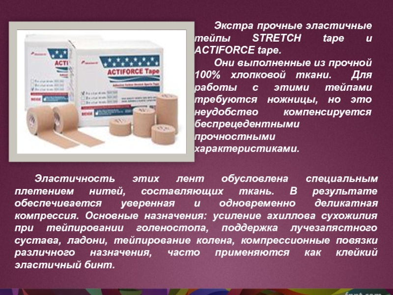 Слайд 18Экстра прочные эластичные тейпы STRETCH tape и ACTIFORCE tape.