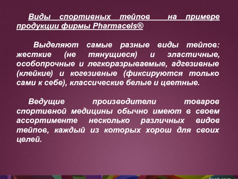 Слайд 14Виды спортивных тейпов на примере продукции фирмы Pharmacels®