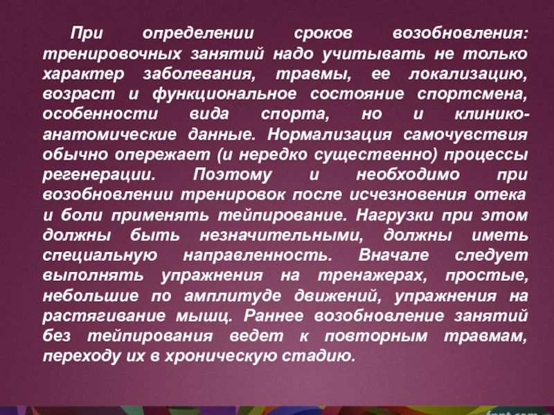 Слайд 5При определении сроков возобновления: тренировочных занятий надо учитывать не только