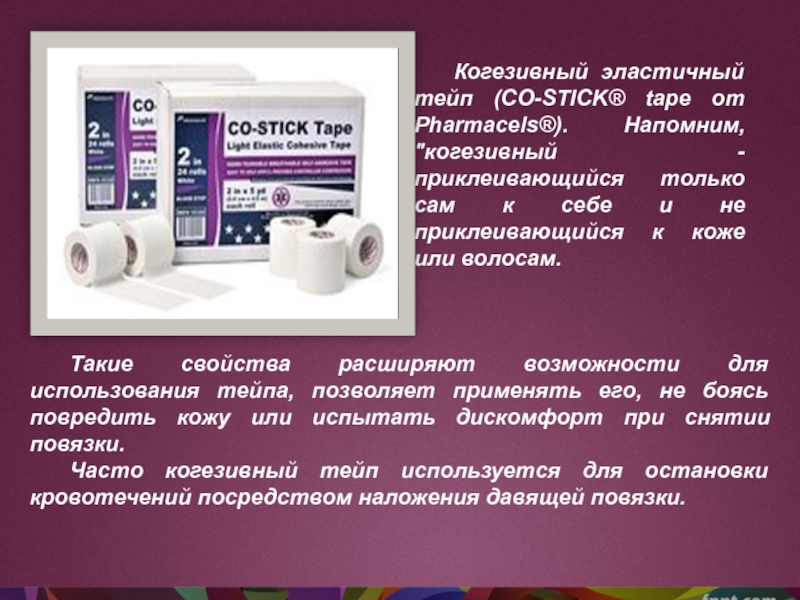 Слайд 19Когезивный эластичный тейп (CO-STICK® tape от Pharmacels®). Напомним, "когезивный -