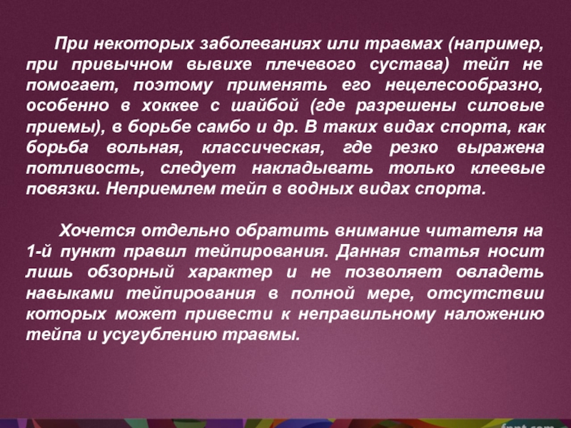хоккее с шайбой (где разрешены силовые приемы), в борьбе самбо и др. В таких видах спорта, как борьба вольная, классическая, где резко выражена потливость, следует накладывать только клеевые повязки. Неприемлем тейп в водных видах спорта.