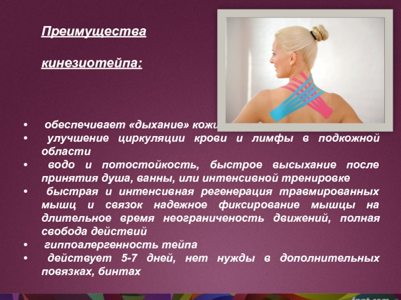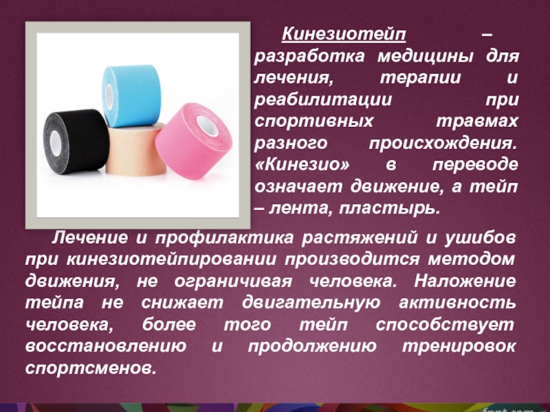 Слайд 24Кинезиотейп – эластичный клейкий пластырь, изготовленный из чистого хлопка имеющий