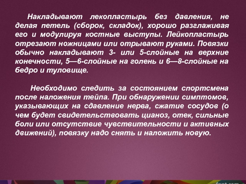 Следует уделить особое внимание защите определенных мест тела от сильного сдавления лейкопластырной повязкой, предотвращая сдавление сосудов и нервов.