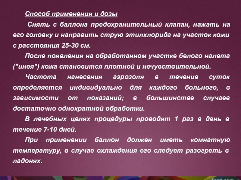 используют газовое распыление хлорэтила. Для быстрого охлаждения травмы в спортивной практике чаще всего применяется аэрозоль хлорэтил (международное наименование: Этилхлорид (Ethyl chloride).