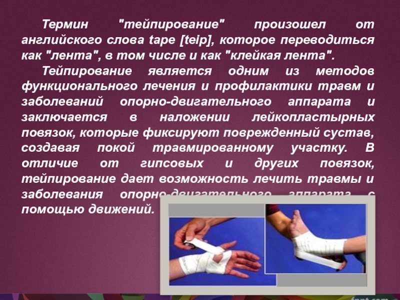 является одним из методов функционального лечения и профилактики травм и заболеваний опорно-двигательного аппарата и заключается в наложении лейкопластырных повязок, которые фиксируют поврежденный сустав, создавая покой травмированному участку. В отличие от гипсовых и других повязок, тейпирование дает возможность лечить травмы и заболевания опорно-двигательного аппарата с помощью движений.