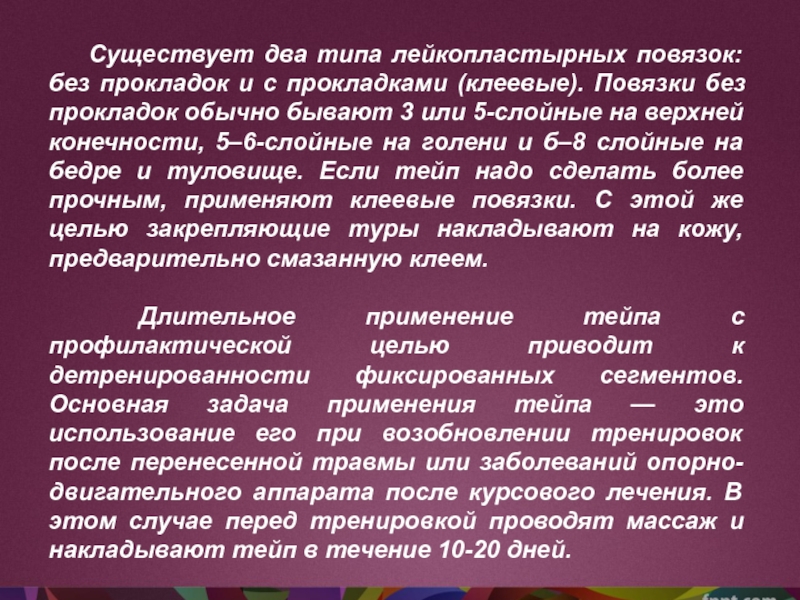 верхней конечности, 5–6-слойные на голени и б–8 слойные на бедре и туловище. Если тейп надо сделать более прочным, применяют клеевые повязки. С этой же целью закрепляющие туры накладывают на кожу, предварительно смазанную клеем.