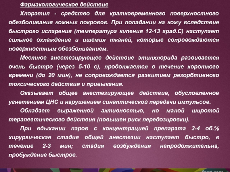 Местное анестезирующее действие этилхлорида развивается очень быстро (через 5-10 с), продолжается в течение короткого времени (до 20 мин), не сопровождается развитием резорбтивного токсического действия и привыкания.