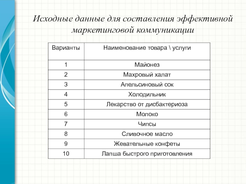 Цель занятия: Умение формировать оптимальную маркетинговую коммуникацию. Задание: используя исходные данные, составьте эффективную маркетинговую коммуникацию для рекламируемых товаров, услуг.
