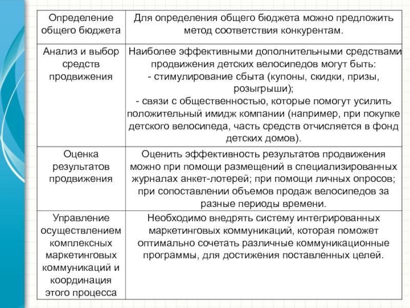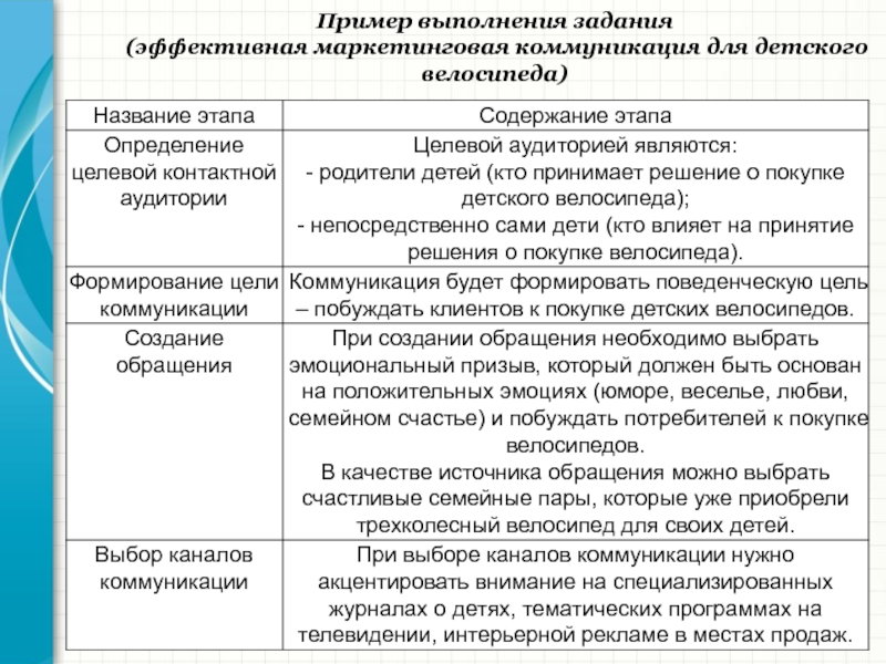 Слайд 11Пример выполнения задания (эффективная маркетинговая коммуникация для детского велосипеда)