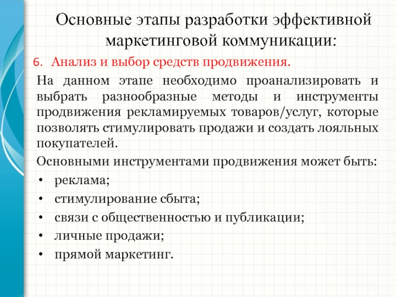 Основные этапы разработки эффективной маркетинговой коммуникации: Анализ и выбор средств продвижения.На данном этапе необходимо проанализировать и выбрать
