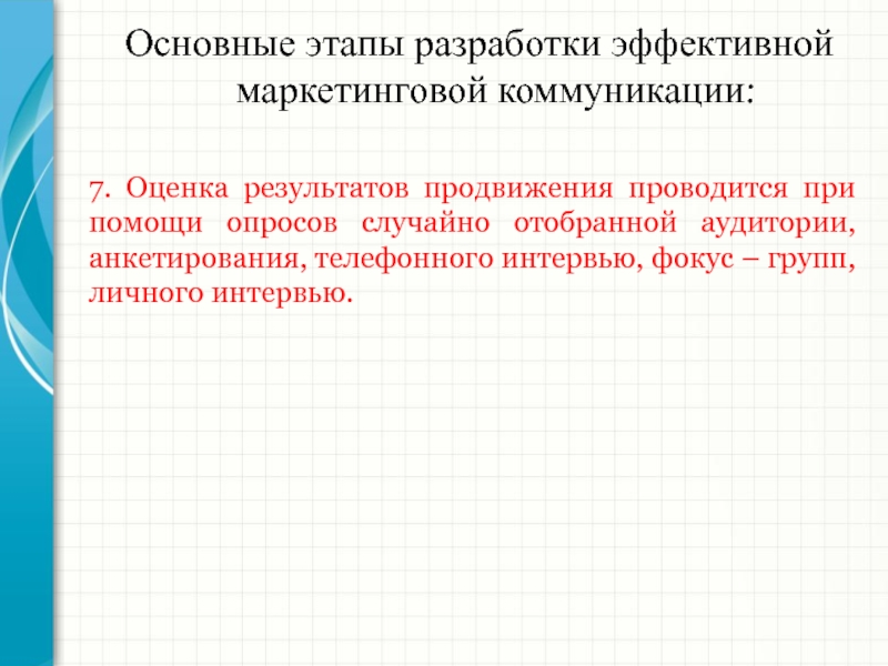 Основные этапы разработки эффективной маркетинговой коммуникации: 7. Оценка результатов продвижения проводится при помощи опросов случайно отобранной аудитории,
